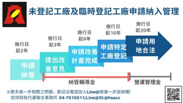 針對農地上既存的未登記工廠,須在2年內申請納管、3年內提工廠改善計畫,